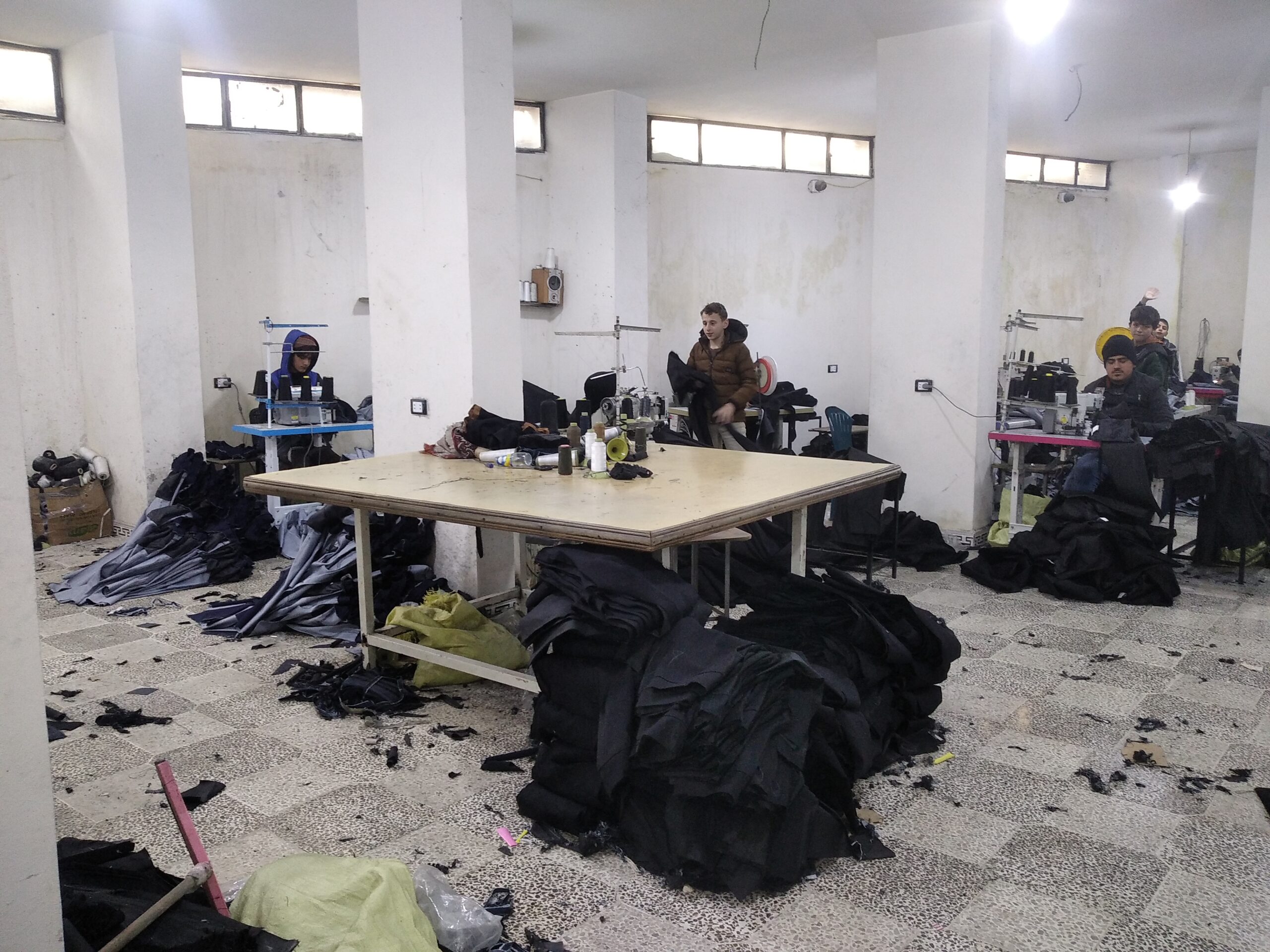في إحدى ورش الجينز في مدينة حلب، يجلس توفيق شويحنة خلف ماكينة الخياطة، ويشير بيده إلى المساحة شبه الفارغة من حوله.