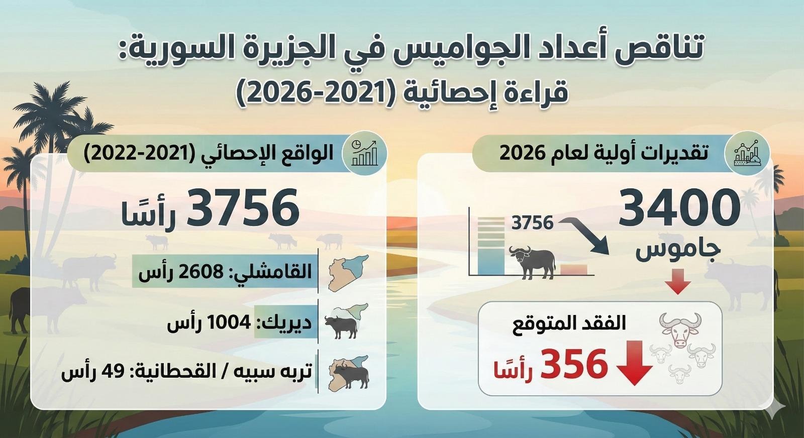 تعكس الأرقام الرسمية أثر هذه الأزمة على أعداد الجواميس في المنطقة. فبحسب دائرة البيطرة في القامشلي، بلغ آخر إحصاء للجواميس في الجزيرة/روج آفا خلال عامي 2021–2022 نحو 3756 رأساً، توزعت بين 2608 رؤوس في القامشلي، و49 رأساً في تربه سبيه/القحطانية، و1004 رؤوس في ديريك.